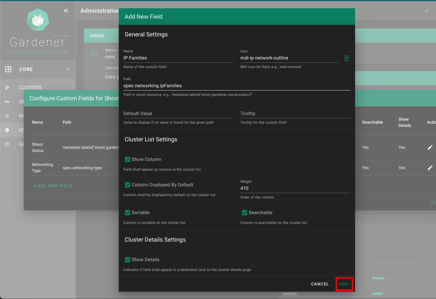 Configure Custom Fields for Shoot Clusterspanel, click on the+ ADD NEW FIELDbutton.